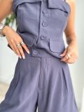 O fechamento é feito com um botão encapado no mesmo tecido, garantindo um acabamento harmonioso e discreto.
