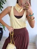 Confeccionada em malha fria, ela tem toque geladinho e caimento fluido, garantindo leveza e movimento a cada passo.