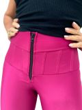 Cós alto com zíper e pala larga na cintura (com detalhes de costura).