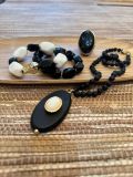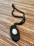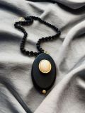 Autêntico e cheio de presença, o colar é feito com contas de pedra vulcânica e fecho ajustável, que permite regular o comprimento (25cm de cada lado, totalizando 50cm). O destaque fica por conta do pingente ovalado em madeira, com pedra marfim central e borda dourada, criando um contraste sofisticado e marcante.