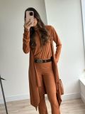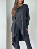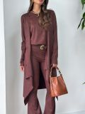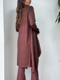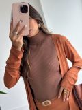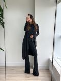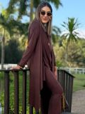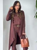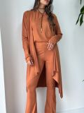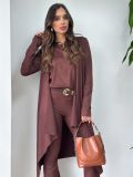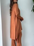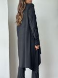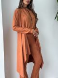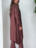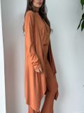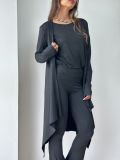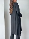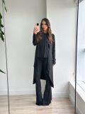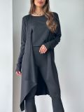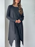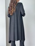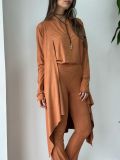 Com comprimento próximo ao joelho, ela tem aquele caimento leve e elegante. As mangas são compridas, o acabamento é a fio (bem moderno!), e o charme principal fica por conta dos recortes em bico na frente, que criam um efeito de pala super diferenciado.