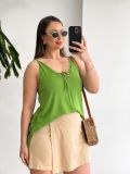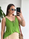 O decote V na frente, adornado com ilhos e um delicado cordãozinho, traz um toque de charme, enquanto o decote U nas costas acrescenta um detalhe especial.