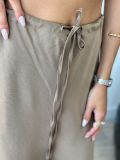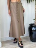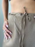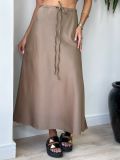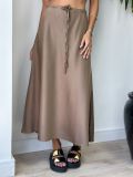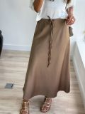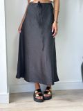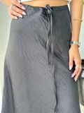 O cós com elástico embutido, e o cordão para amarração no mesmo tecido oferecem um ajuste personalizado e prático. Feita em "cetim crinkle", um tecido acetinado com textura amassadinha, a saia exala sofisticação de maneira discreta.