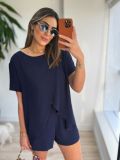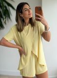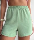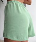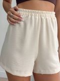 O short é confeccionado em crepe fluido e texturizado, com cintura alta e cós totalmente elástico, garantindo ajuste perfeito e liberdade de movimento.