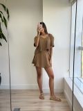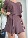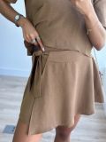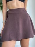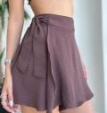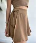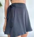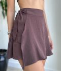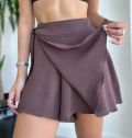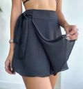 Na frente, o design é inovador: um tecido extra se sobrepõe e forma um transpassado que pode ser amarrado na lateral, criando o efeito de uma saia com a praticidade de um shorts.